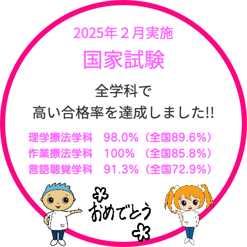 理学療法士・作業療法士・言語聴覚士として医療・福祉の現場で活躍するためには、年1回行われる国家試験を受験して合格する必要があります。本校では学生支援センターを中心に行う国家試験対策に加え、それぞれの学科の特性に合わせた国家試験対策に取り組んでおり、毎年高い合格率を達成しています。